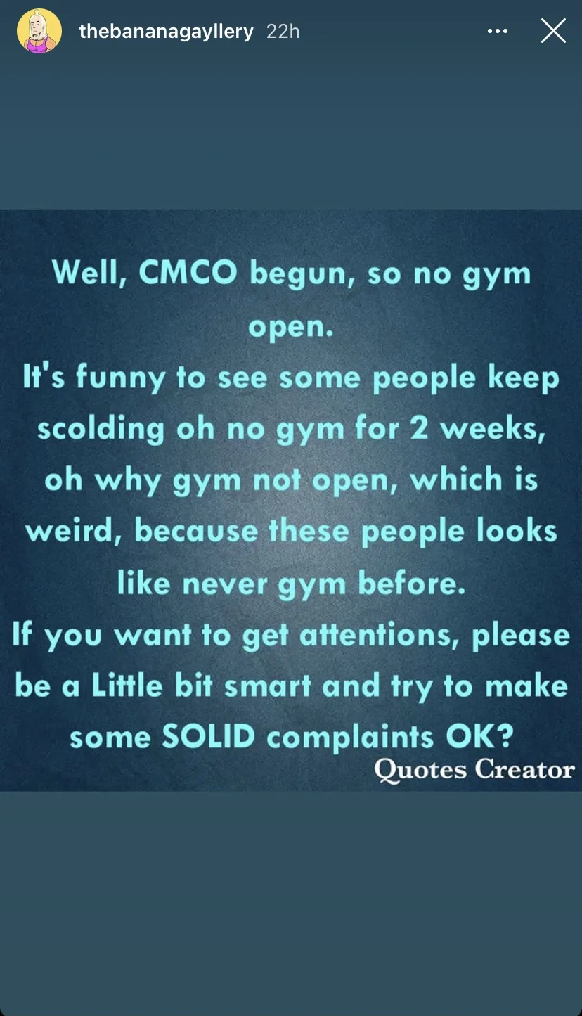Malaysian TV and radio host, Maggy Wang, who owns a fitness studio herself, has spoken out against the issue stating that “gyms are not (an) essential.”