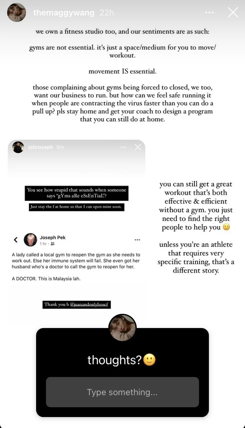 Maggy posted a story on her Instagram profile, @themaggywang, expressing her opinion that gyms shouldn’t reopen because it is non-essential. She explained that gyms are “just a space/medium for you to workout/move.”