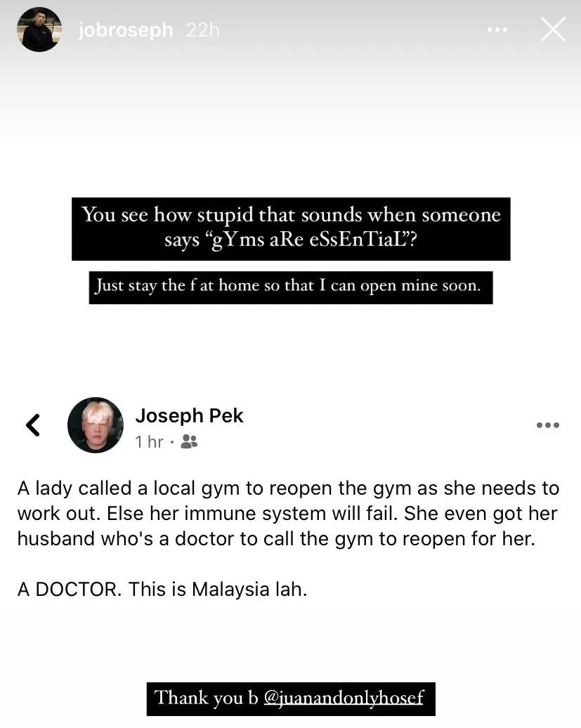 Based on the IG story, the issue came to the couple’s attention after a Facebook user, Joseph Pek, shared a story about a lady who requested a local gym to reopen in order for her to work out, or else her immune system would fail. The lady even got her husband, who is a doctor, to convince the gym to reopen for her over the phone.