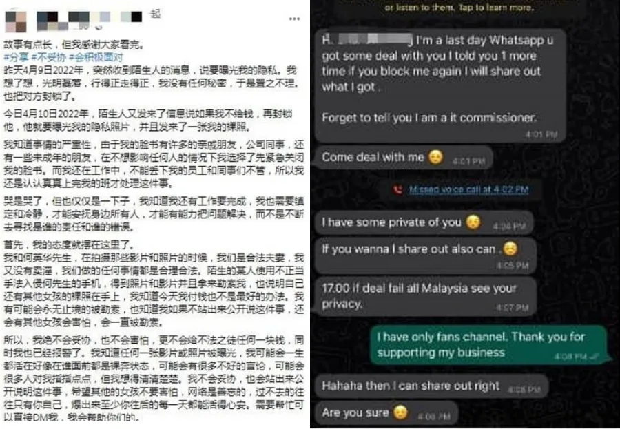 According to the post, she had been contacted by said hacker on Saturday (9th April) at 4pm. The message supposedly stated they would expose her. But, Deng’s immediate response was to block the contact. They contacted her again the next day, and this time, got her attention by giving her proof of the photos. They stated that she needed to pay them RM1,500 to ensure they wouldn’t release said photos.