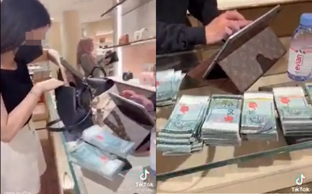 The short clip showed the woman taking bundles of RM50 out of her handbag and placing them on the counter. There had already been several stacked on the counter. Another clip showed her counting out one wad of cash while the person filming laughingly thanked her. The lady also asked the cashier doing the transaction about her total, to which he replied “RM21,000“.