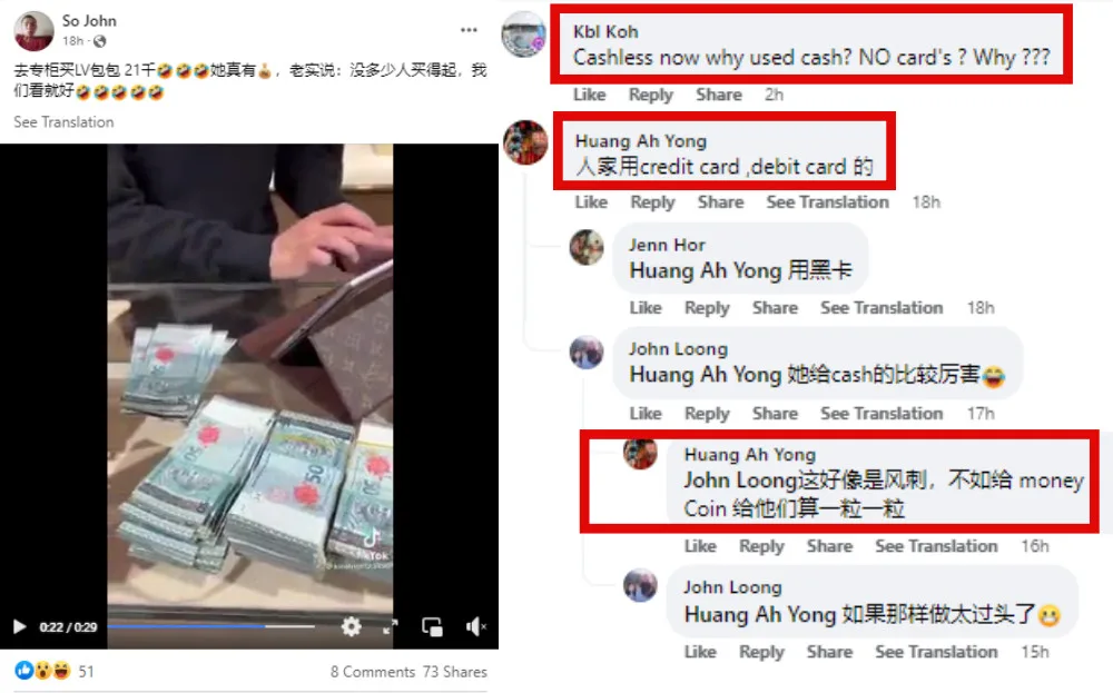The last few seconds simply showed the wads of cash stacked and lining the counter, along with a brief shot of the bought bag. Netizens however questioned the lady’s logic. They pointed out that most did their transactions cashless nowadays. “No cards?” one asked emphatically. “Why???” Another comment observed that most people used either credit or debit card to pay for such purchases. “It’s better to give them coins and let them count it out one by one,” another said sarcastically.