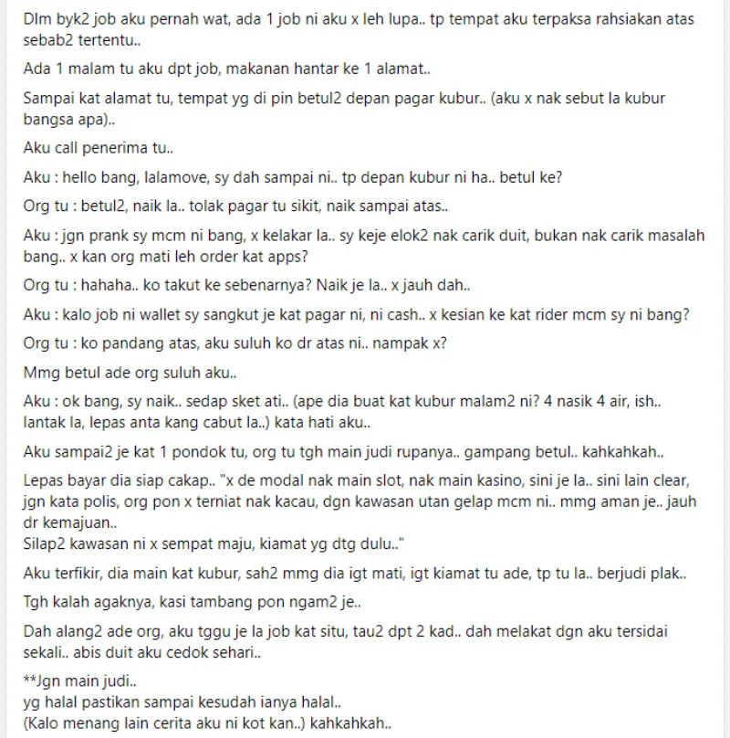 Recently, a Lalamove rider posted on the Lalamove Malaysia Facebook group to share their story of how they had to deliver a customer’s food order at an unexpected location. Much to their horror upon arrival, the address given was actually a cemetery. “I called the customer asking if this was the right address cause I was in front of the cemetery’s gates.” The customer confirmed that it was the right location.