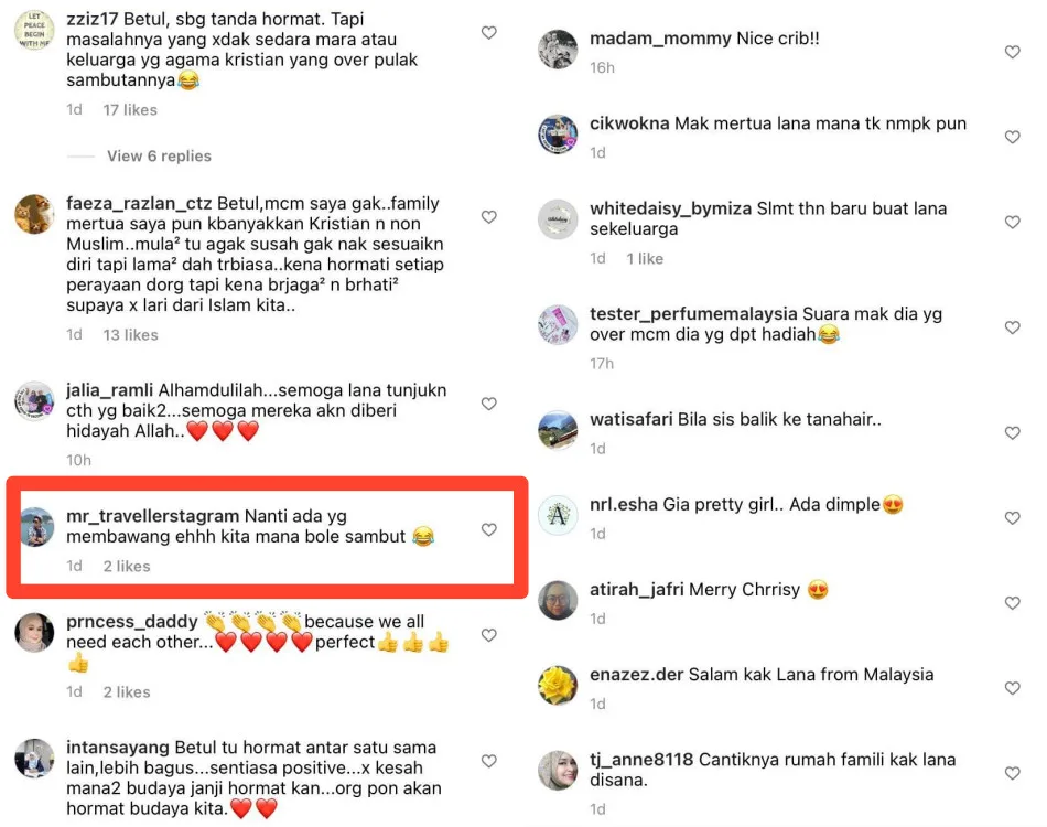 The post was met with several remarks left by netizens on Instagram. Many of them echoed Lana’s statement in regards to respecting each other’s cultures and beliefs without practising any discrimination. Not only that, there was also one commentator who appeared to throw some shade at the holier-than-thou community who often blast other people.