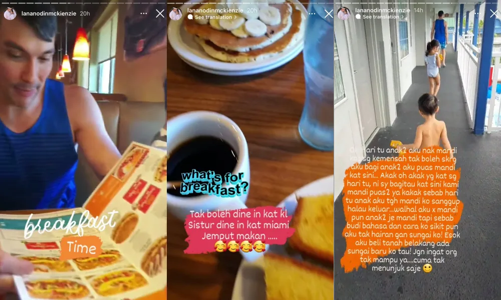 In addition, the “Aku Yang Kau Gelar Isteri” actress also took to her Instagram Story to share some captured moments during their arrival in the States. Among the moments captured include the family having their breakfast. She pointed out that she could still dine in at the restaurant, despite not receiving the vaccine. Lana sarcastically wrote, “I couldn’t dine in at KL, so I had my meal in Miami. Bon Appétit!”
