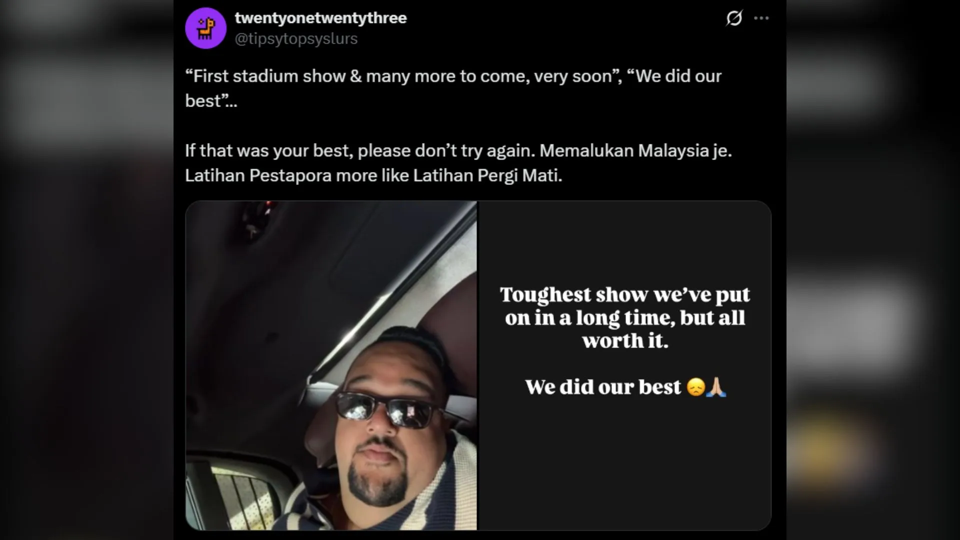 But it wasn’t just the fans paying the price. One performer shared that she had to carry a cello on foot for 1.2km to get to the venue – because apparently, a proper artist drop-off point was too much to ask. No loading zone, no access lane, just vibes and cardio. If this was meant to be “Latihan,” then yes – we were all being trained. Just not for a concert. For survival.