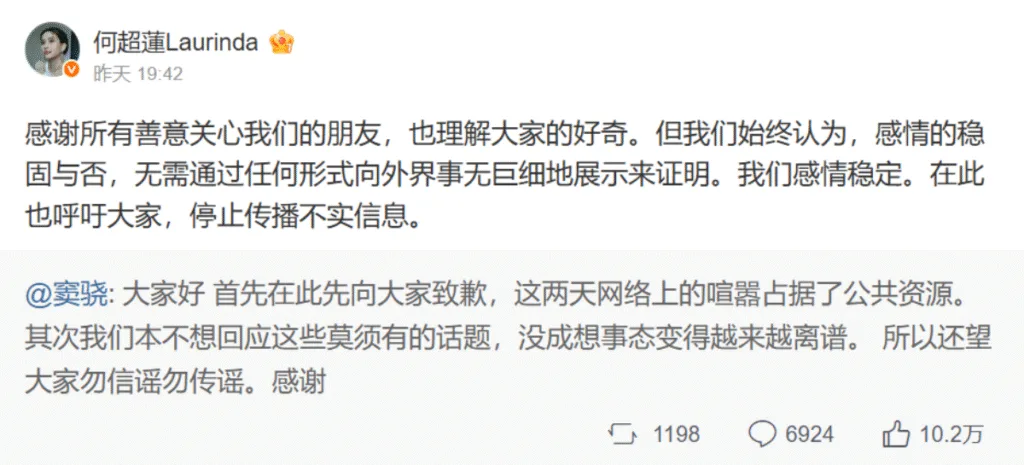 While divorce isn’t necessarily a bad thing, being accused of separating when it’s not true can have a negative impact. Recently, Hong Kong socialite Laurinda Ho (何超蓮) and Chinese actor Shawn Dou (窦骁) have been plagued with separation rumours, prompting them to speak up.