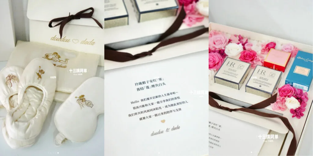 That wasn’t all that got released. Someone also uploaded the wedding return gifts and needless to say, their gifts were fairly extravagant! From the photo, it can be seen that Laurinda and Shawn took great care to pamper their guests. Wedding guests received a luxury brand day and night cream, perfume, chocolate, custom made silk eye mask and slippers . The gift alone reportedly cost over HKD 5,000 (~RM2,800).