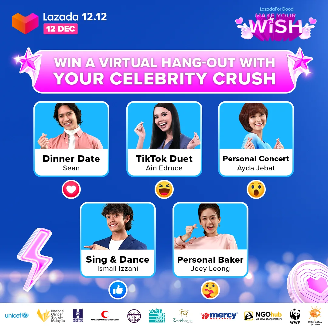 Five lucky donors who donated to any of the NGOs on LazadaForGood from now until the eve of “12.12” on 11th December, will have the chance to virtually hangout one-on-one with favourite local celebrities, including Sean Lee, Ain Edruce, Ayda Jebat, Ismail Izzani and Joey Leong. The winner will then be announced during the 12.12 Chief Discount Officer Show on LazLive (11th December, between 9pm to 11pm).