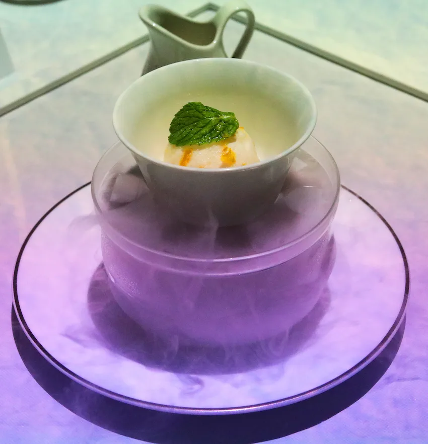 Once the sorbet was served onto our tables, diners were asked to pour water into a dry ice holder that rested under the sorbet. As soon as we followed these instructions, a cloud of smoke rose from the dry ice to beautifully envelope the sorbet that stood on its pedestal.