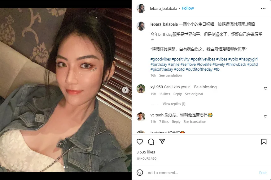 The model released a post on her social’s yesterday to address the uproar over the simple kiss. “A small birthday greeting has made trouble all over the city…” Lebara sighed. “(My) birthday wish was for world peace but it’s the other way around (now). I guess I made the wrong wish~”