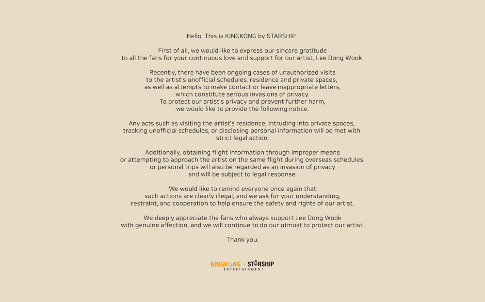 In its official statement, Kingkong by Starship emphasised that such actions will no longer be tolerated. The agency declared its intent to pursue “strict legal action” against any form of privacy infringement, including unauthorised visits, leaks of personal information, or stalking activities involving the actor’s private life.