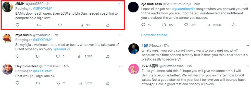 While the apology garnered sympathy with some wishing him well, others weren’t as happy. Several have demanded results rather than an apology. One also advised Zii Jia to return to BAM. “Even LCW (Lee Chong Wei) and Lin Dan needed coaching to compete (at) a high level,” the comment read.