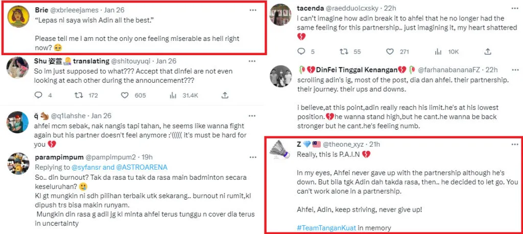 “Adin (Izzuddin) said he’s not (feeling this partnership anymore), so that was a signal for me,” the 26-year-old stated. Sounding like he was holding back tears, Sze Fei continued with, “I wish Adin all the best.” Notably enough, the duo did not look at each other during the exchange. Sze Fei also added a quiet, “We just want to do our best and (we’re) not blaming anyone.”
