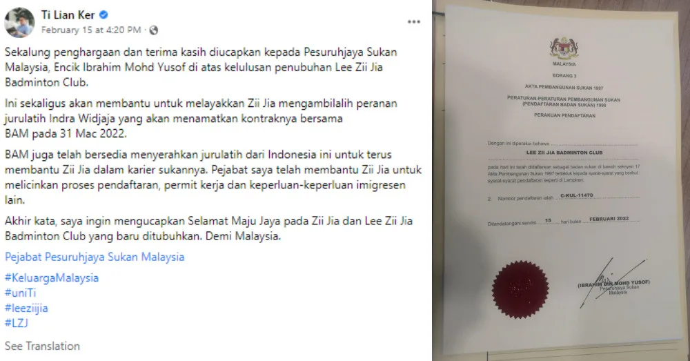 On 15th February (Tuesday), Youth and Sports Deputy Minister Ti Lian Ker confirmed the formation of Zii Jia’s club aptly named Lee Zii Jia Badminton Club. Additionally, the statement announced that Indonesian coach Indra Wijaya would be joining Zii Jia’s club to lend him a hand. It’s rather timely as Indra’s contract with BAM is set to end by 31st March.