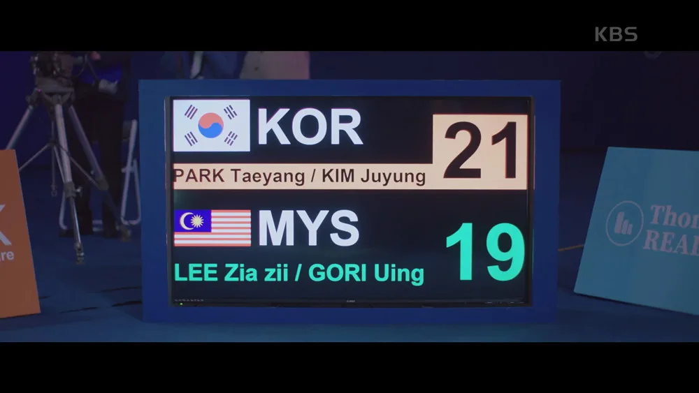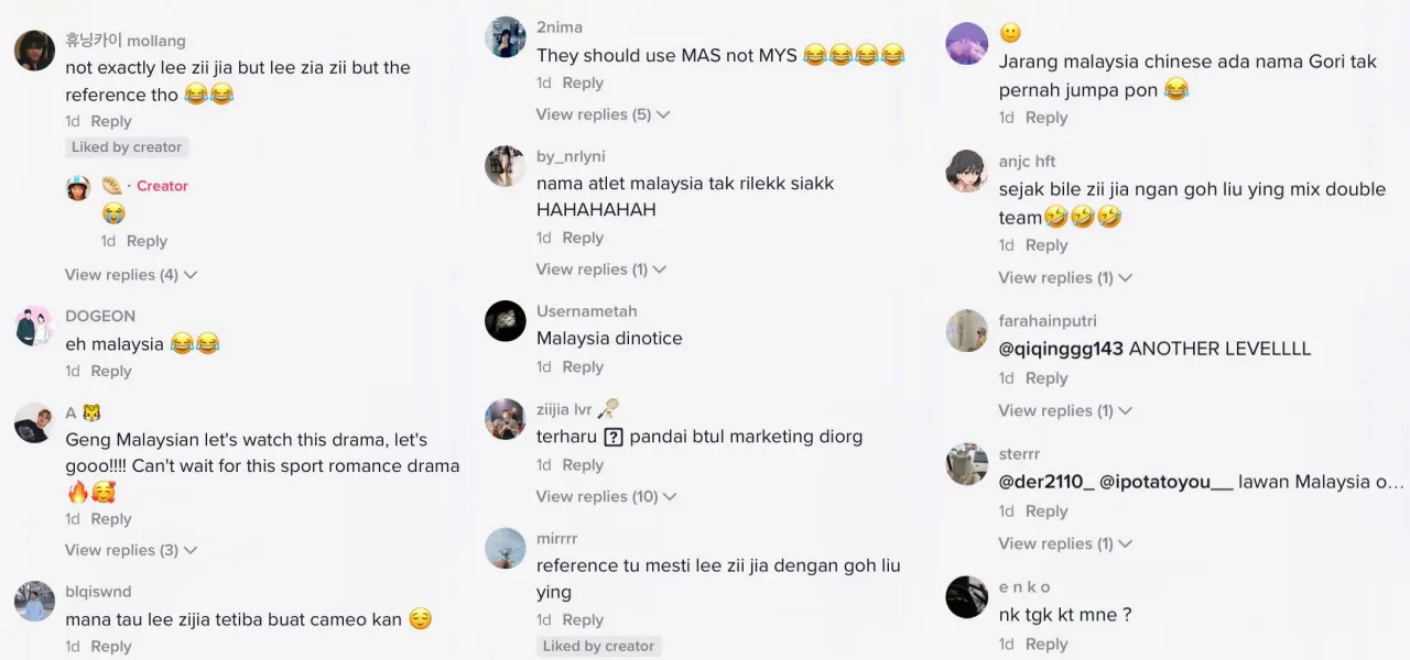 As seen in the video shared by local TikTok user known as @tingkeobel, the character Park Tae Yang (played by Ju Hyun) and her partner Kim Ju Yung can be seen competing in a doubles badminton match against players from Malaysia. As the team of Park and Kim managed to score a win for Korea, the scoreboard appears to show the names “Lee Zia Zii” and “Gori Uing” as representatives from Malaysia.