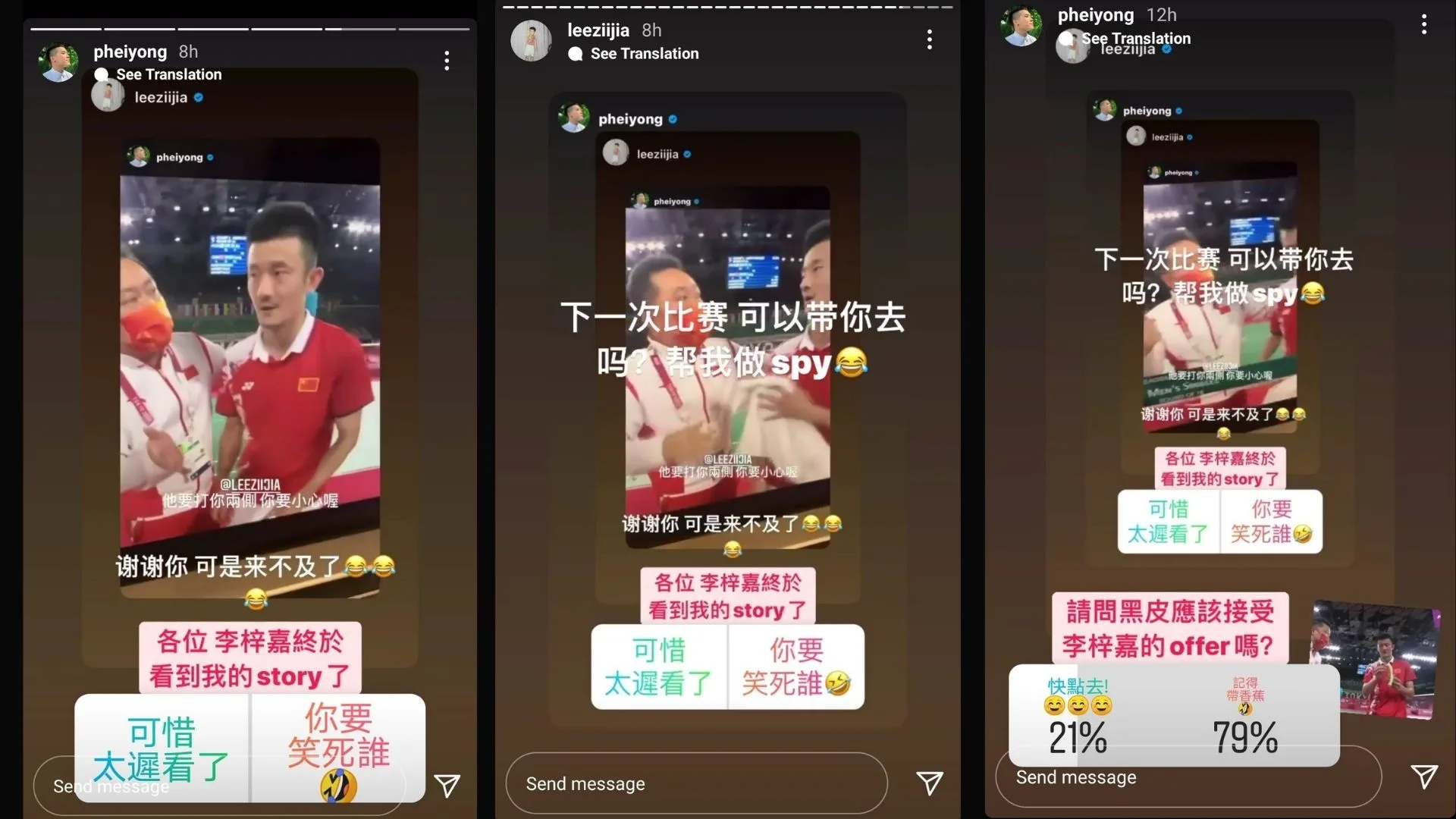 Following this, social media influencer and MY fm DJ, Phei Yong (培永), tagged Lee Zii Jia on his Instagram Stories and told him to beware of both sides. And our beloved national athlete’s, response was hilarious. He replied, “Thank you, but it’s too late.”
