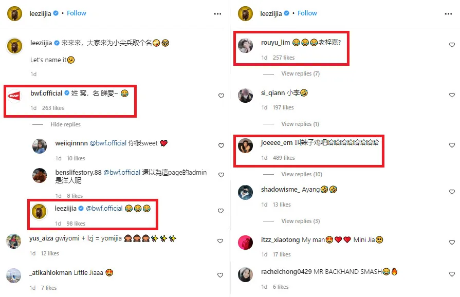 “Surname Wo (窝), name Di Ai (睇愛)” the Badminton World Federation suggested, which when put together supposedly means “love”. Zii Jia definitely loved that one. Another fan suggested Lao (Old) Zii Jia (老梓嘉), a throwback to the time Zii Jia mistyped his name on Instagram. Others gave names such as Small Lee (小李), Spicy Chicken, Ayang and Mini Jia.