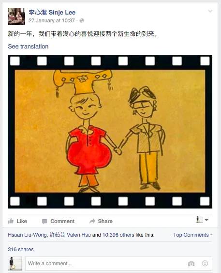 Angelica took to her Weibo as well as her Facebook page to share the happy news, posting, “In the new year, with hearts filled with joy, we’ll welcome the arrival of two new lives!”
