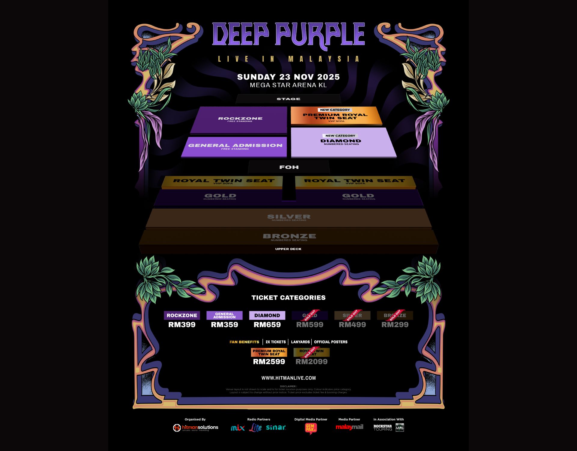 Due to overwhelming demand, organizers have released additional seated tickets, opening up Diamond (RM659) and Premium Royal Twin Seat (RM2,599) for fans who want an enhanced view of the legends in action. Standing options like General Admission and Rockzone remain available—perfect for those who want the classic concert energy up close.