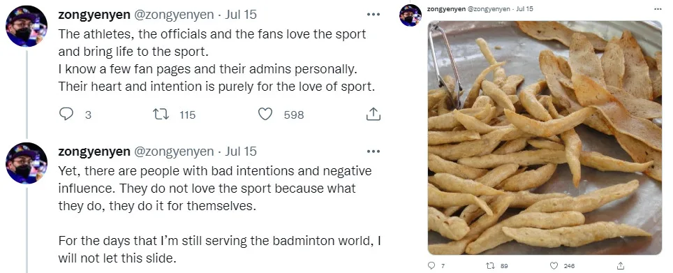 As it turns out, one of those protesting claimed to be part of the social media staff of the Badminton World Federation socials. The person claimed that while some fans love and bring life to the sport, there are some who do not. “They do not love the sport because what they do, they do it for themselves,” they wrote and added a photo of keropok lekor, clearly hinting at Lek Gor.