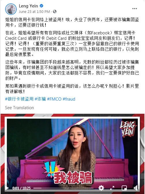 Leng Yein stated that she does not do online shopping, but she knows one should be careful when using a credit card on an online platform. The DJ advised people to be alert about their card. “Be sure to pay more attention to your bank card usage records,” she said. “If you find anything suspicious, you must contact your bank immediately so that you will (avoid) ending up in debt.”