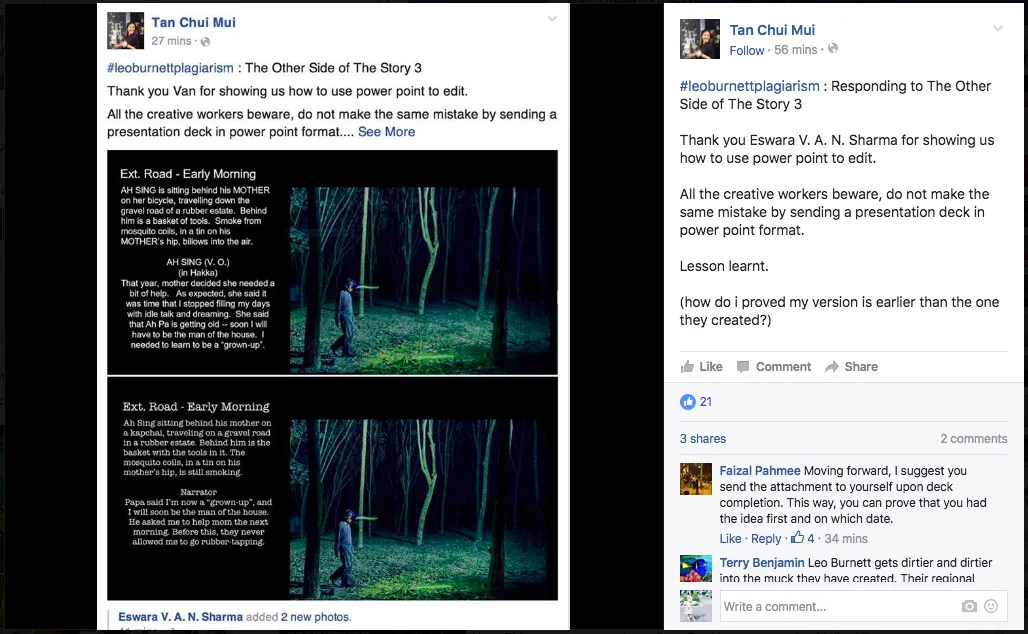 In her first post, she claimed, “For many months I was just keeping quiet. As I do not like to waste time complaining. But I can’t believe how an Ad Agency like Leo Burnett can just use the story I had pitched to them without asking my permission. And when my team Bea Meow and We Jun met them, their lawyer told them that Malaysian law does not protect idea. And the creative writer said they had only used two of the major scenes, not the whole story.”