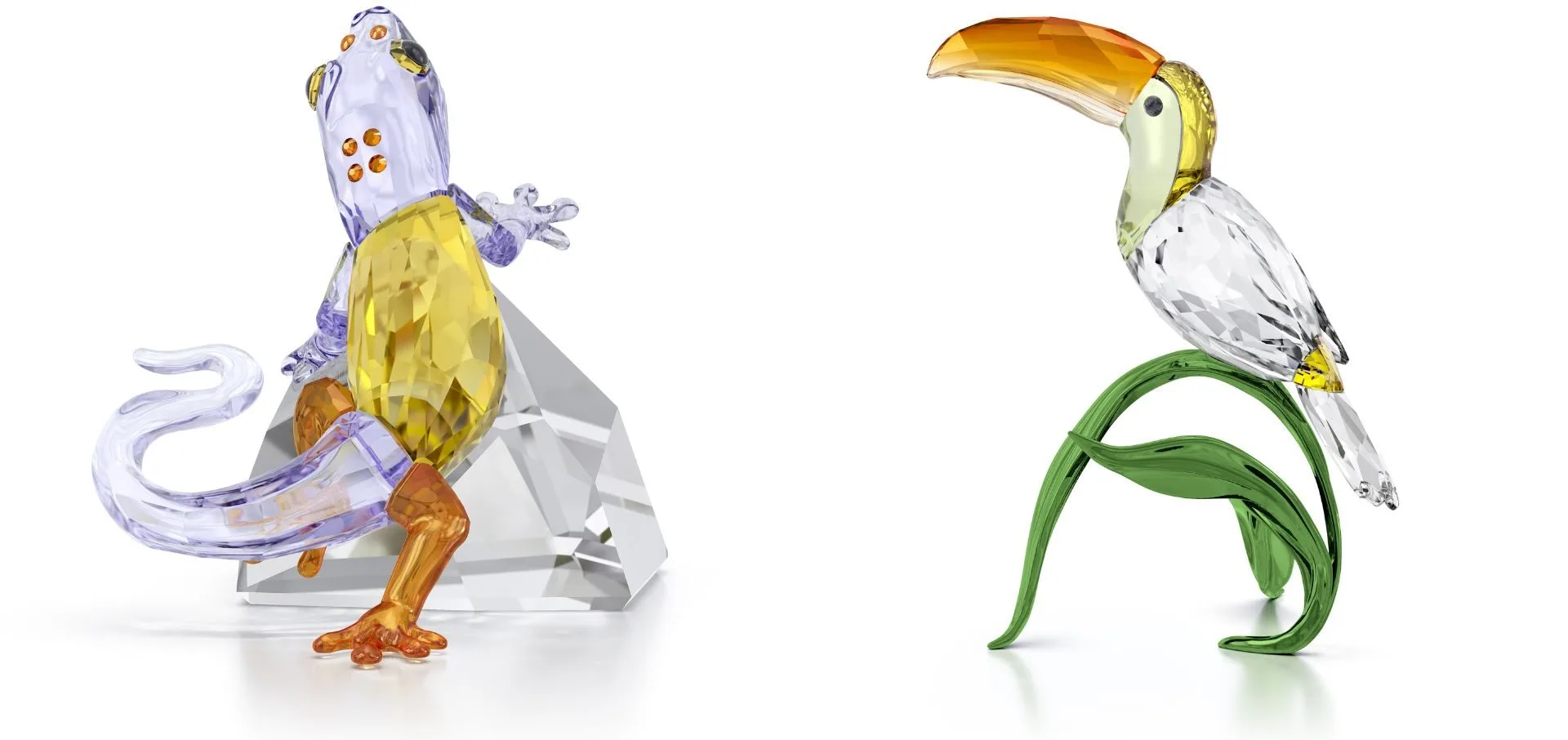 From a Toucan with a brightly-hued beak perching atop lacquered metal leaves to a colourful gecko resting upon a meticulously cut-crystal base, the collection explores the opulence of the untamed world.