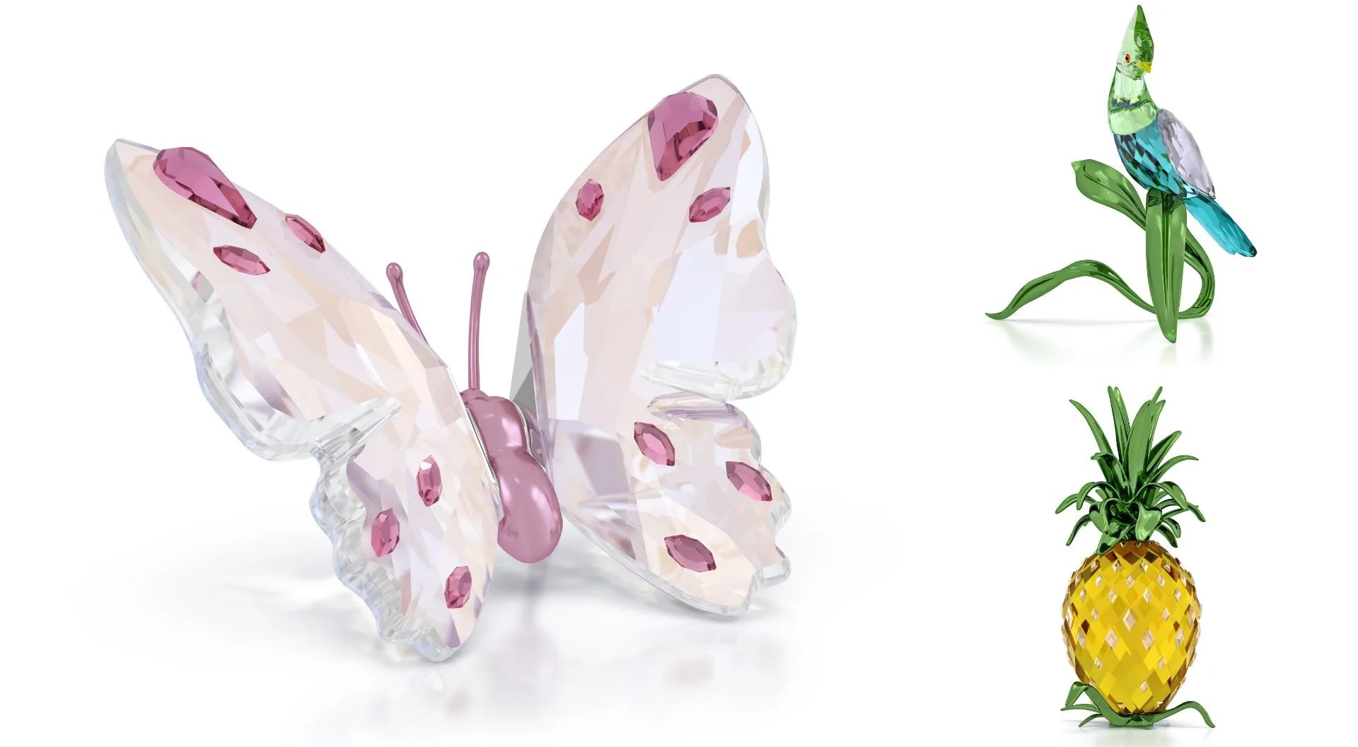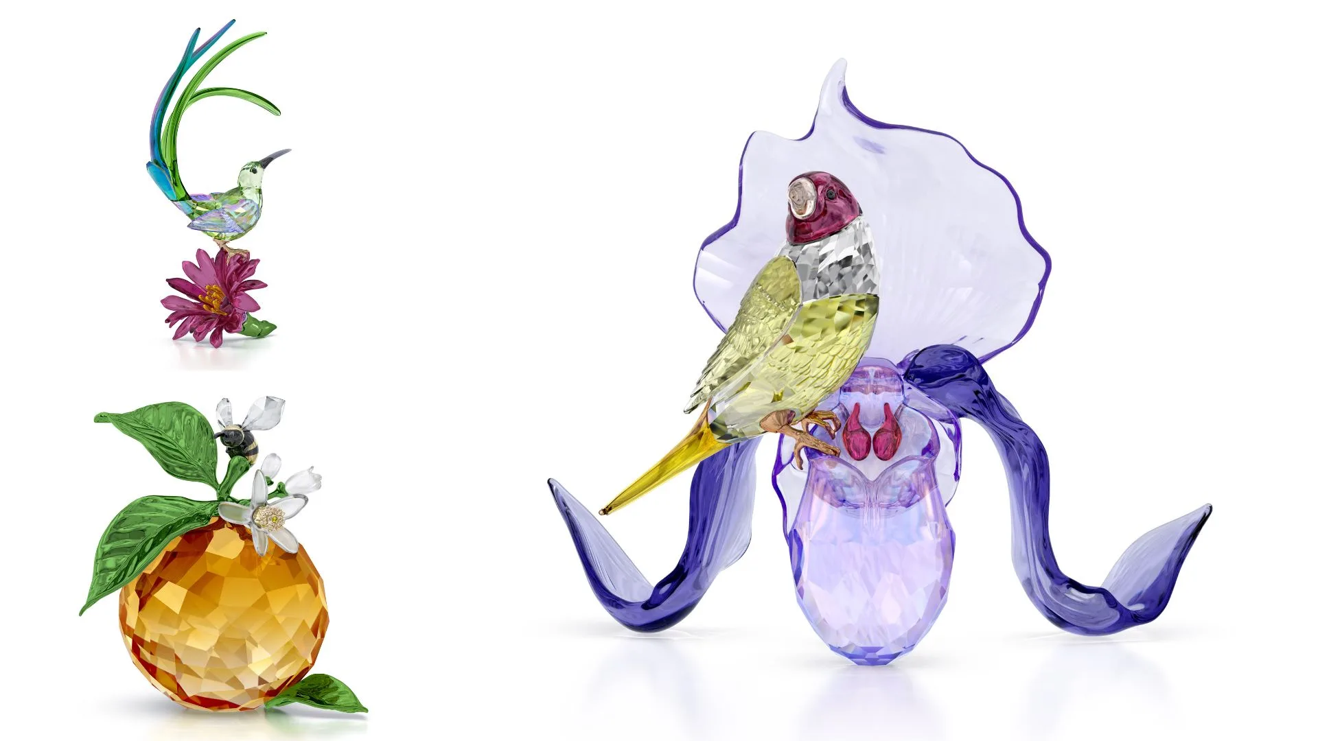 Swarovski’s mathemagical garden extends into the tropics for Spring/Summer 2025, with the new season’s crystal masterpieces within the Idyllia family capturing the lush allure of tropical forests. Each creation presents a magical interpretation of the natural world, capturing animals, birds, fruit, and flowers with brilliantly-coloured crystals and warm golden tones.