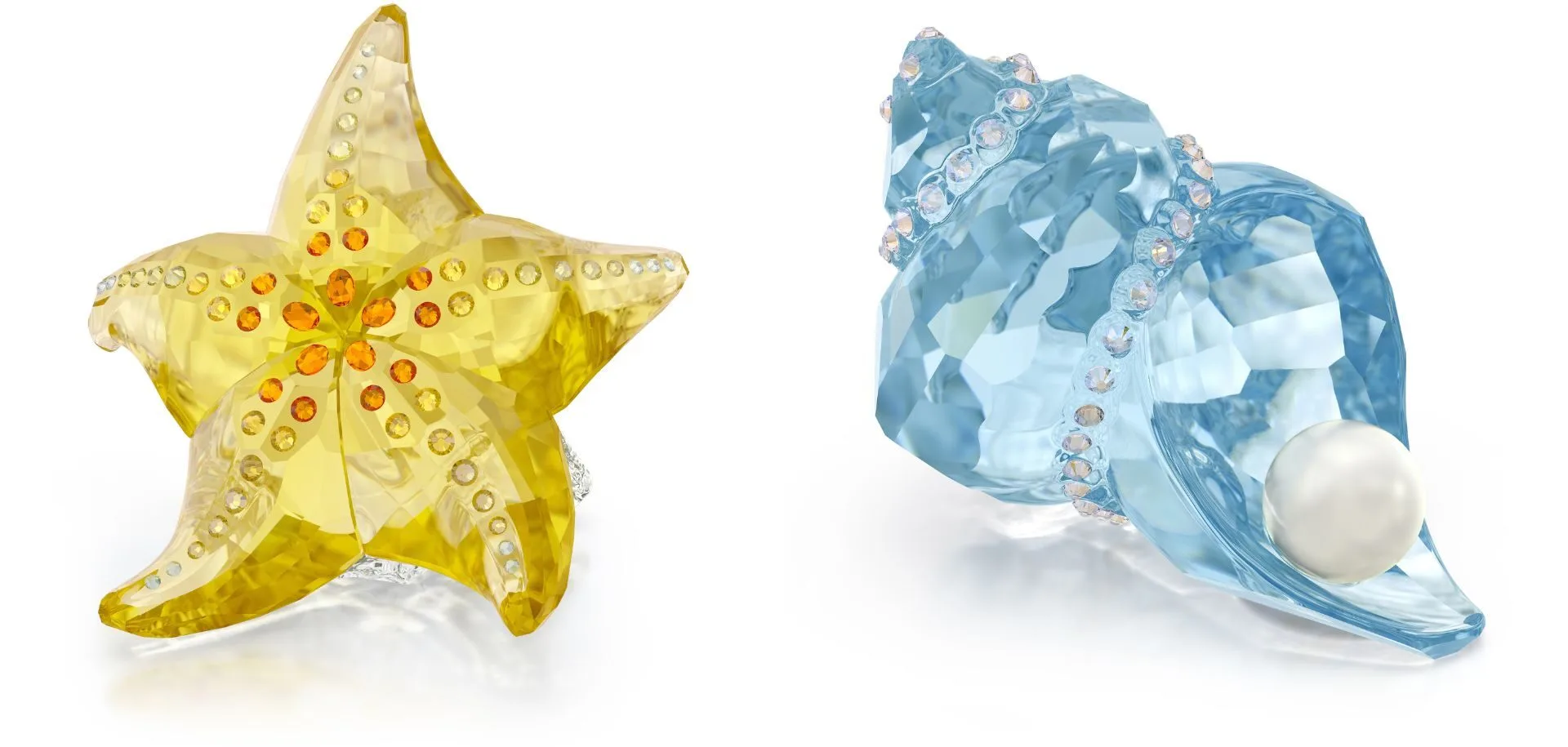 The Conch Shell and Pearl reveal the hidden beauty of the underwater realm in Aquamarine, Crystal with Shimmer effect, and a stunning Swarovski Crystal pearl, whilst the Starfish is rendered in Crystal, Light Topaz, Sun, Jonquil, and Crystal with Moonlight effect.