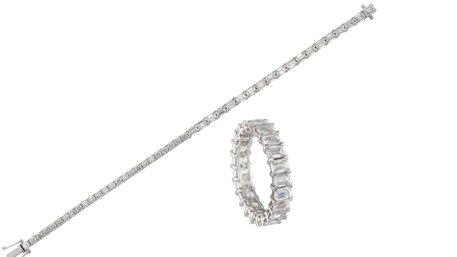 The bracelet glows with 7.51 carats of round and emerald-cut diamonds, while the ring sparkles with 3.69 carats of emerald-cut stones. Designed to impress, both set in 18K white gold while showcasing exceptional clarity and craftsmanship for a luxurious touch to any ensemble, day or night.