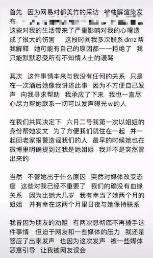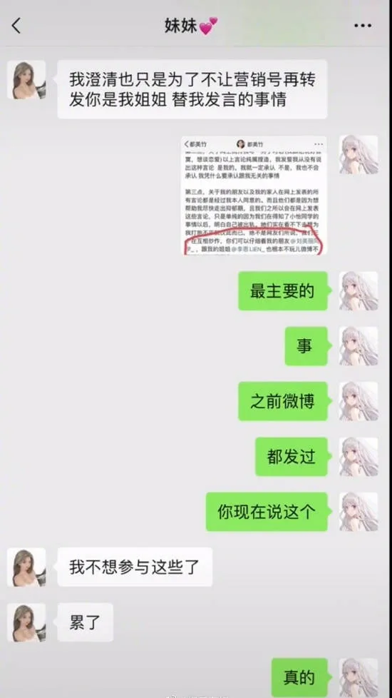 During the chat, Li also shared a screenshot of a text conversation with an individual (believed to be Du) explaining that she had already told the media to stop yxh accounts (marketing accounts) from “reposting that Li was her sister”.