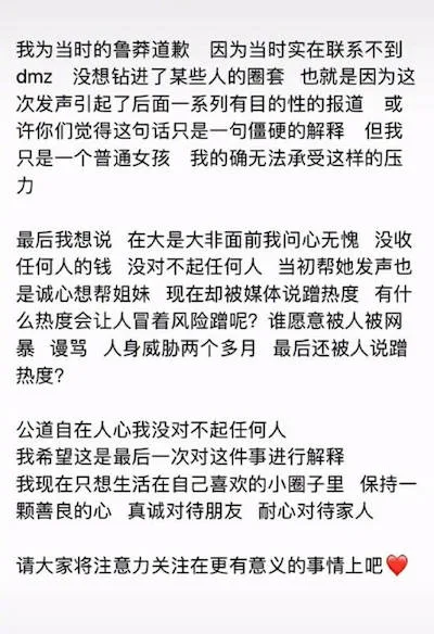Li then concluded her chat with the digital press by saying that she “has a clear conscience, didn’t receive any money, and isn’t sorry to anyone”. She then clarified that she only did it to help Du, but the media depicted her as though she was doing it for cheap publicity.