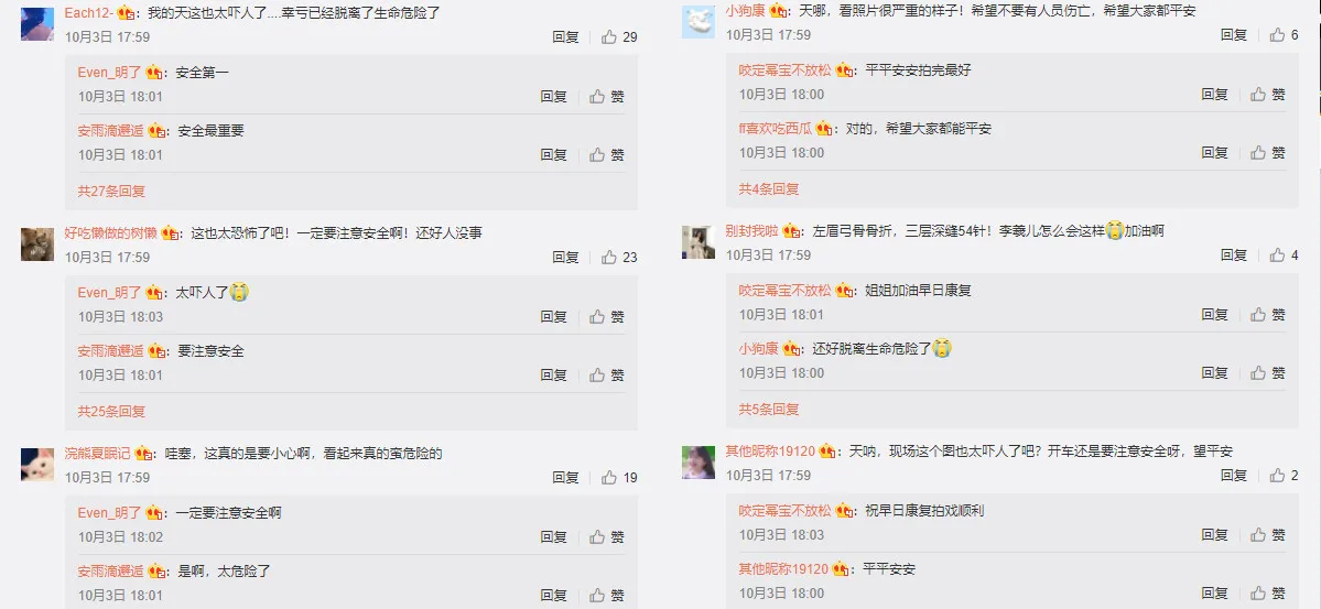 Fans were worried after viewing photos of the accident which were circulated on the internet. Many posted reminders to be careful when driving, others expressed their thankfulness that Li was not in life-threatening danger. Fans also wished Li a speedy recovery and requested she rest well.
