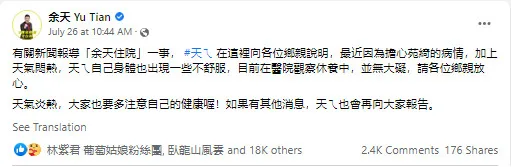 Thankfully, Yu Tian is recovering well in the hospital and has reassured his followers via his socials. However, there has not been news on Yuan-chi yet. Our hearts and prayers go out to the family. We hope they will receive good news soon.