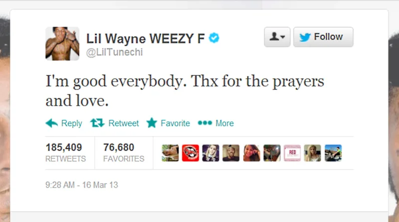That one tweet was retweeted over 180,000 times by his 10,536,392 followers. On top of that, Mack Maine (the head of the record label, Young Money, to which Lil Wayne is signed) also tweeted, “Don’t believe the nonsense about comas and tubes to breathe…that’s false!”.