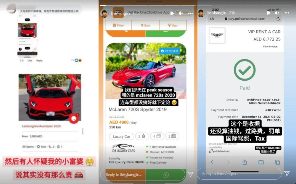 “Some people suspect my little rich woman,” he stated on his Instagram story. “(They) said (the supercar rental) is not that expensive.” He immediately pulled out the receipts for the rental explaining they had embarked on the trip during peak season. As such, the prices would have gone up. According to his displayed receipt, the couple had actually rented the car for AED 6,772.25 (~RM7,758). Apparently, he had rounded up the amount to RM8,000 as there were other factors involved.