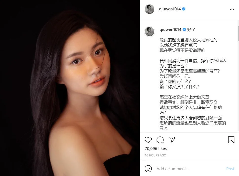 Qiu Wen stated that when online celebrities make a fuss on social media, fabricate facts, and take things out of context, it doesn’t help their image. “You will only let more people see your ugly side,” Qiu Wen said, speaking as another social media influencer. She clarified that her post was not meant to garner attention and increase her popularity. It was meant to be directed to the influencer circle. Qiu Wen felt that drama would distract people from wholesome content. “Traffic should be given to creators who create value and joy,” she said, emphasising that it was especially important during the Full Movement Control Order (FMCO).