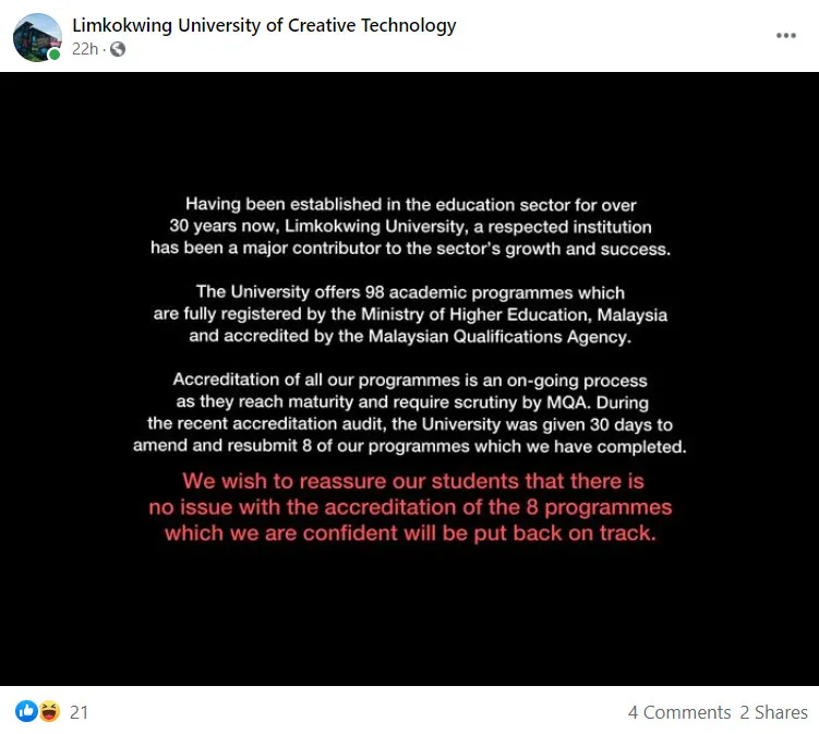 Last night (3rd May), the university posted an announcement on their Facebook page. They stated that they were taking steps to restore accreditation for eight of its programmes. They were given 30 days following a “recent audit” to amend and resubmit the eight programmes for accreditation. The university announced they have already done so and are confident the eight programmes will be put back on track.