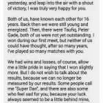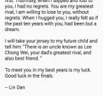 The “letter” then ended with, “The 37th time I meet you opposite the net, it’s already gone a whole round since our first. Truthfully, when I slipped and lost to you, I had no regrets. You are my greatest rival, I am willing to lose to you, without regrets. When I hugged you, I really felt as if the past ten years with you, had been but a dream. I will take your jersey to my future child and tell him: ‘There is an uncle known as Lee Chong Wei, your dad’s greatest rival, and also best friend.’ To meet you in my best years is my luck. Good luck in the finals.”