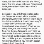 “Because of you, only there exists a better me. I’ve gotten almost all possible champions, yet still do not dare to put down the defence and slack. I could have sang it is lonely to be undefeated (rough translation of a song name), if not for you being there, the one forcing cold sweat from me, the one facing me every time we went to the finals with you opposite the net. You went all out to chase up to me, it’s not like I could let you just surpass me like that. You trained, I trained. You wouldn’t accept losing, I didn’t dare slack,” Lin Dan “wrote”.