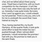 Almost immediately after the game, a supposed letter from the other Chinese player, long-time archenemy and friend of Lee Chong Wei, Lin Dan, surfaced. Lee Chong Wei had played Lin Dan the previous day in the Rio Olympics men’s singles badminton semi-finals, a historic match that Lee Chong Wei won 15-21, 21-11, 22-20 in 79 minutes. It marked the first time ever that Lee Chong Wei defeated Lin Dan in an Olympics game.