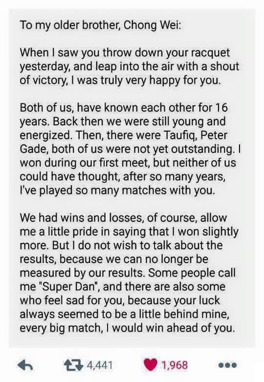 Lin Dan’s “letter” was the one that was translated and later spread like wildfire on the interwebs.