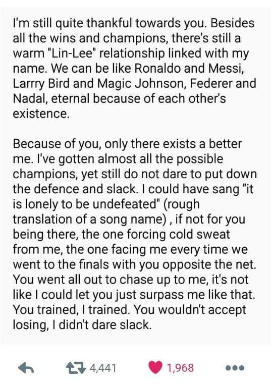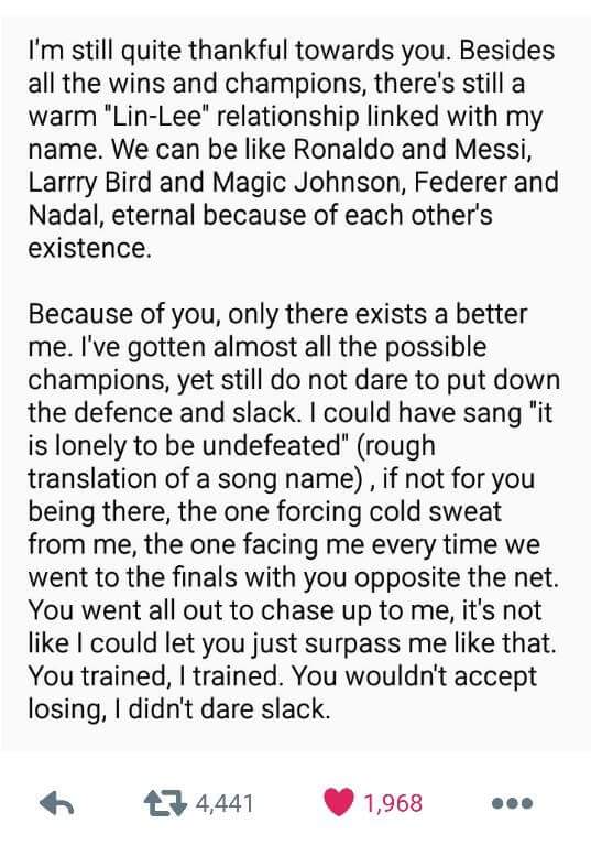 “Because of you, only there exists a better me. I’ve gotten almost all possible champions, yet still do not dare to put down the defence and slack. I could have sang it is lonely to be undefeated (rough translation of a song name), if not for you being there, the one forcing cold sweat from me, the one facing me every time we went to the finals with you opposite the net. You went all out to chase up to me, it’s not like I could let you just surpass me like that. You trained, I trained. You wouldn’t accept losing, I didn’t dare slack,” Lin Dan “wrote”.