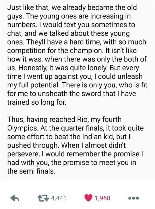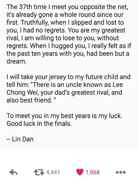 The “letter” then ended with, “The 37th time I meet you opposite the net, it’s already gone a whole round since our first. Truthfully, when I slipped and lost to you, I had no regrets. You are my greatest rival, I am willing to lose to you, without regrets. When I hugged you, I really felt as if the past ten years with you, had been but a dream. I will take your jersey to my future child and tell him: ‘There is an uncle known as Lee Chong Wei, your dad’s greatest rival, and also best friend.’ To meet you in my best years is my luck. Good luck in the finals.”