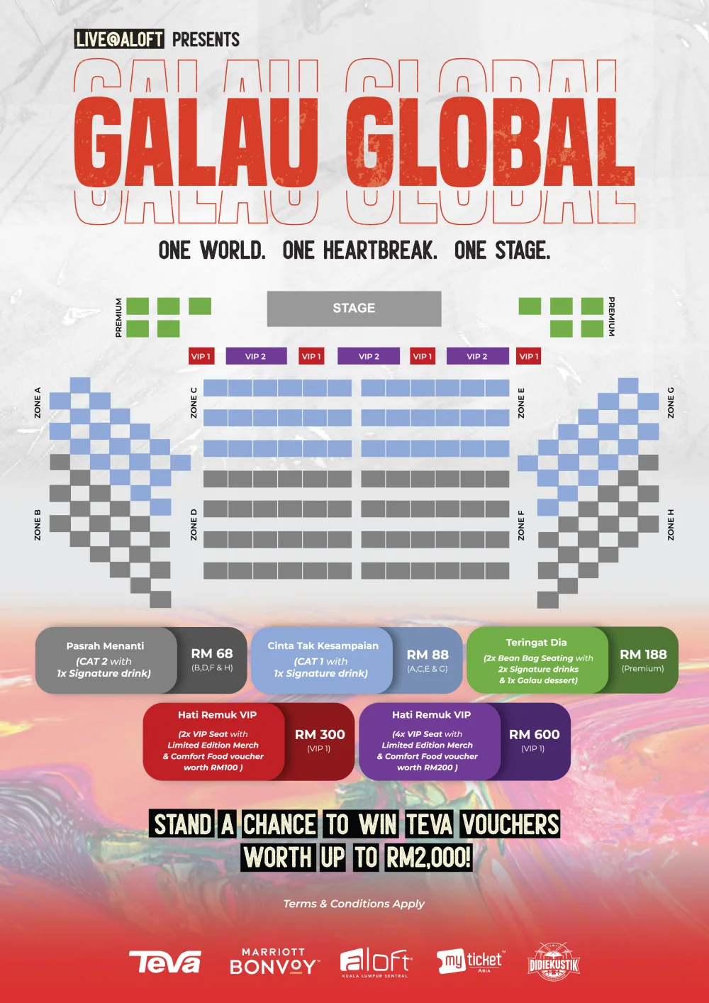 - Ticketing: Pasrah Menanti – RM68, Cinta Tak Kesampaian – RM88, Teringat Dia – RM188, Hati Remuk VIP (RM300x2, RM600x4)