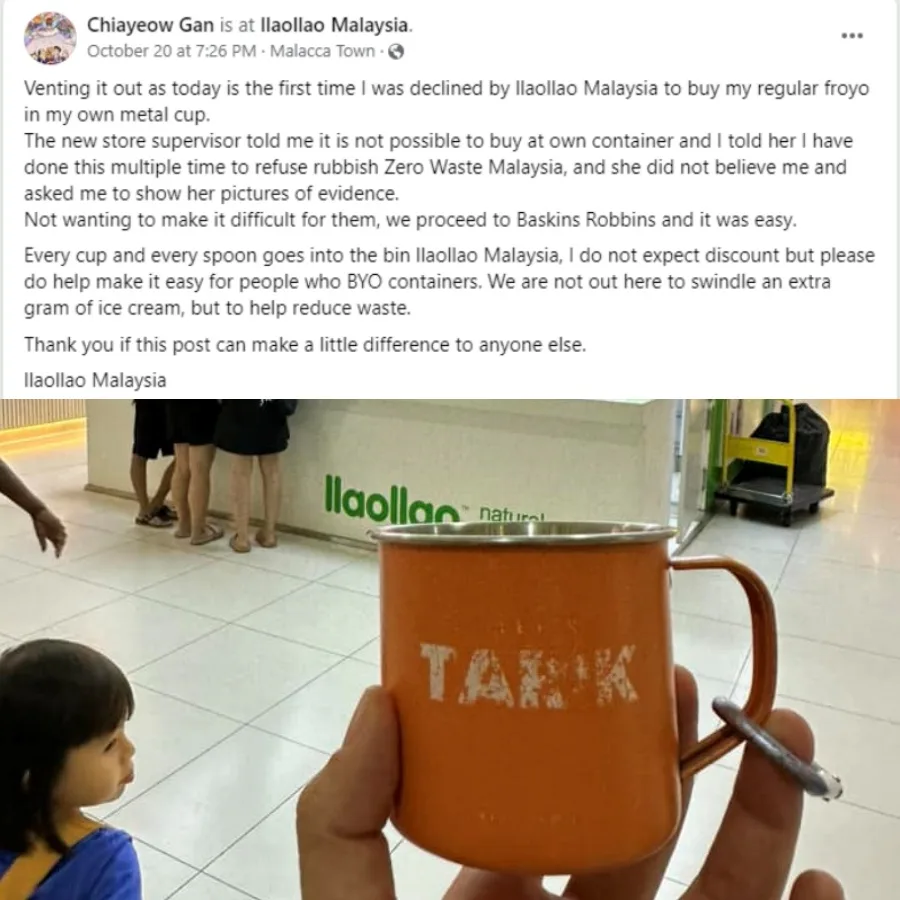 Over the weekend, a local woman named Chiayeow Gan posted on the Zero Waste Malaysia Facebook group to share her experience of ordering at a llaollao outlet in Melaka, without specifying the exact location. The customer said she wanted to buy a froyo and asked the staff to prepare the dessert in her own metal cup that she brought with her.