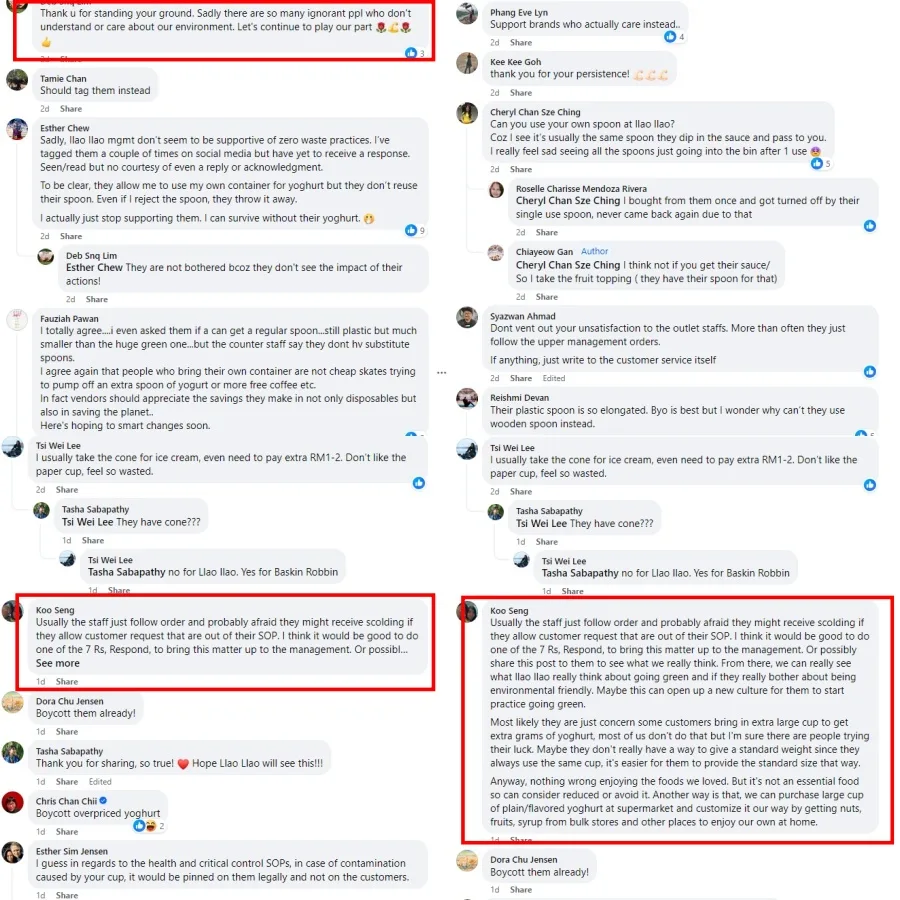 Not wanting to argue any longer, the customer simply left with her family to go have ice cream at Baskin Robins instead. “This was the first time I was declined by llaollao Malaysia. Every cup and every spoon goes in the bin. I do not expect a discount but please do help make it easy for people who bring their own containers as we are not out here to swindle an extra gram of ice cream but to help reduce waste,” she wrote.