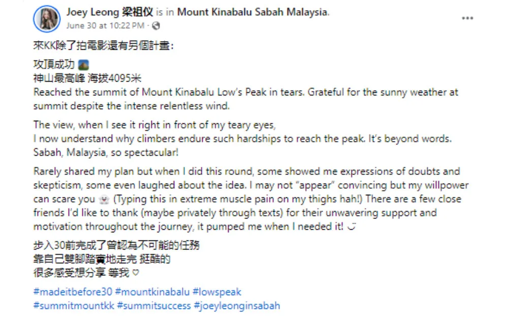 While different people see success in many different ways, it’s safe to say that conquering a literal mountain is a feat for just about anyone. Recently, local actress Joey Leong (梁祖仪) shared that she had crossed off a long-time goal from her bucket list – reaching the peak of Mount Kinabalu.