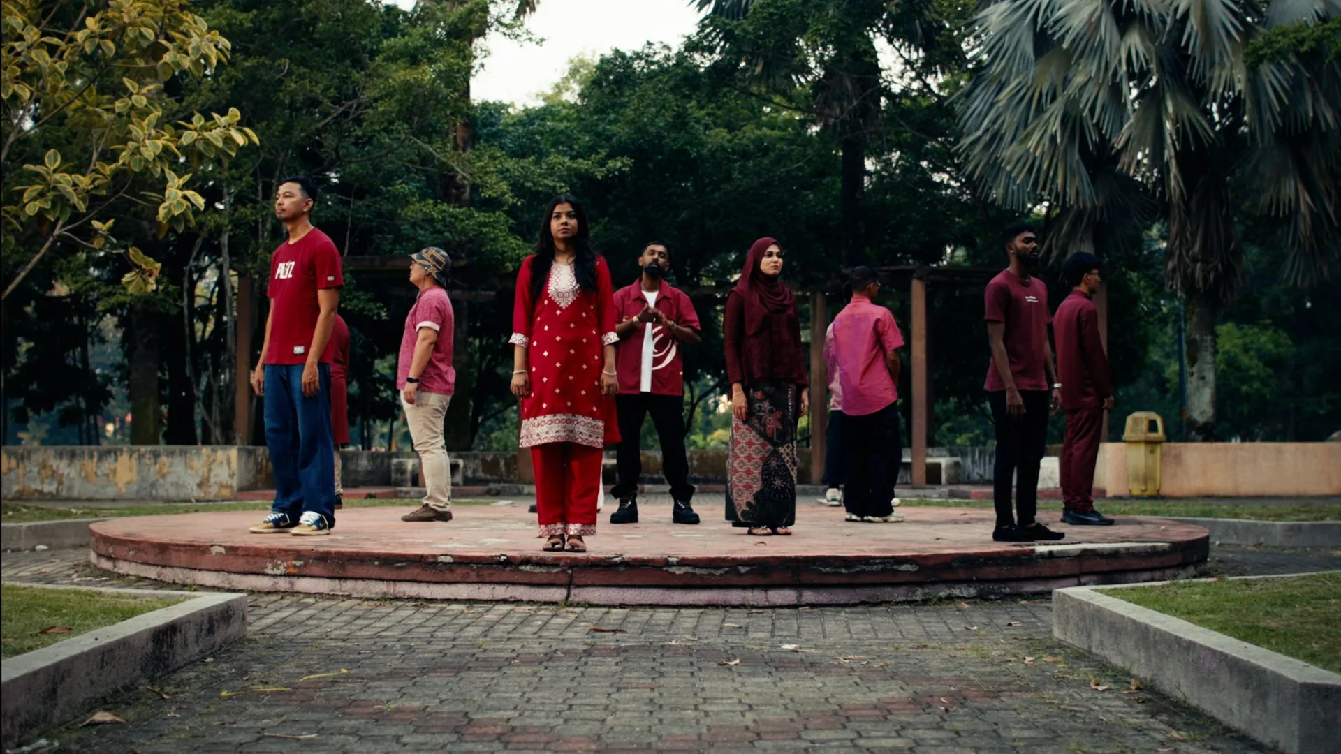 The climax comes in the “Circle of Unity” sequence, where a diverse group of Malaysians dip their hands in red paint and form a symbolic circle of shared identity. A dramatic scene between Balan Kash and the police resolves peacefully with a handshake, representing reconciliation and understanding. These visuals are reinforced with stylised performance shots – from flashing police cars to a bold red background – underscoring themes of pride, courage, and love for the nation.